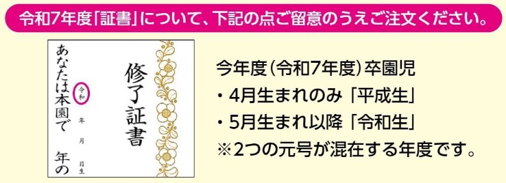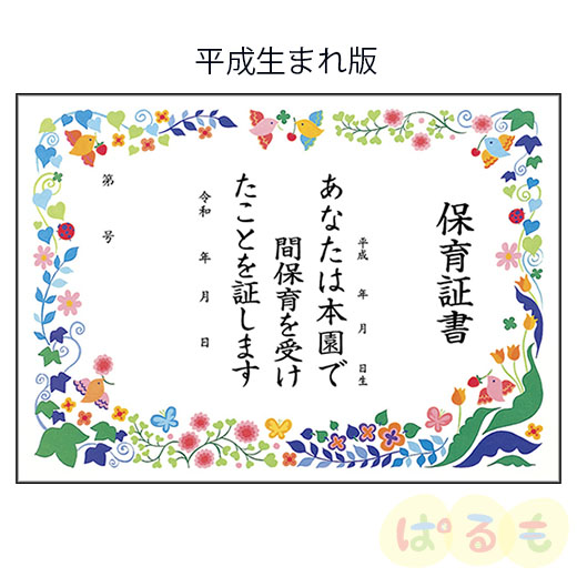 カラフルなカラー印刷の修了証書。平成生まれ版と令和生まれ版があります。
