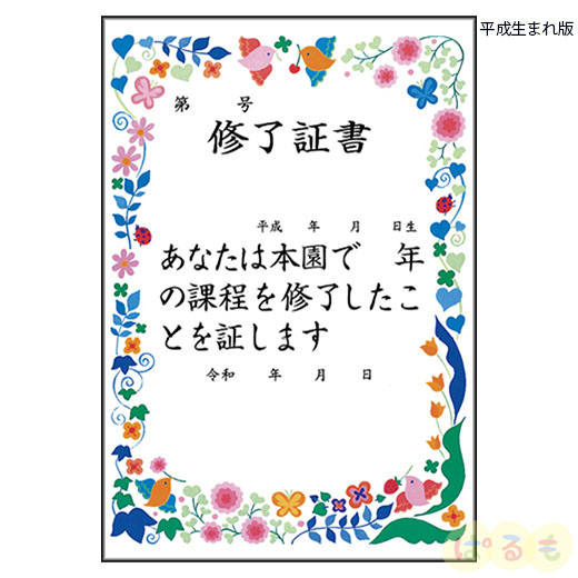 カラフルなカラー印刷の修了証書。平成生まれ版と令和生まれ版があります。