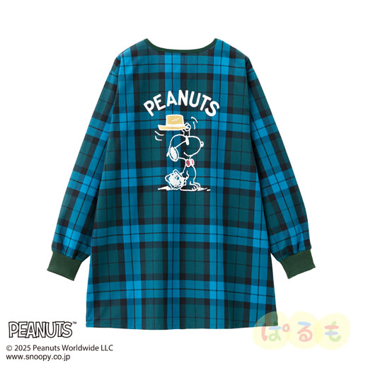 おめかししたスヌーピーとウッドストックがかわいいスモックです。タータンチェックがポイント。袖先はリブ付き。