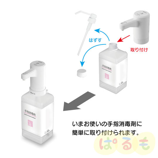 市販の手指消毒剤ボトルに取り付けるだけで、オートディスペンサーになります。噴射量は3段階に切り替え可能。