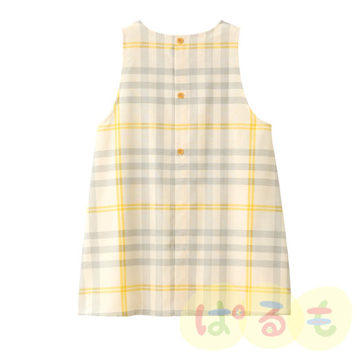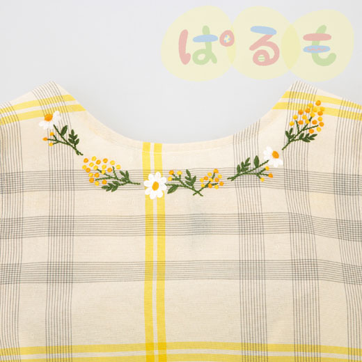 首周りのお花の刺しゅうがちらり。サイドポケットの切り替えもかわいいエプロンです。