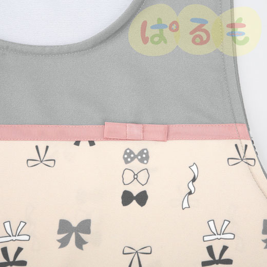 いろんなリボンがプリントされたエプロンです。胸のピンクもかわいい!