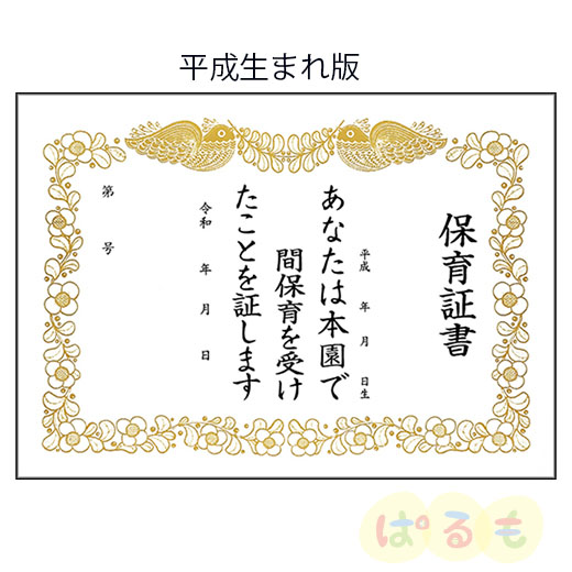 格調高い金刷り枠の保育証書です。平成生まれ版と令和生まれ版があります。