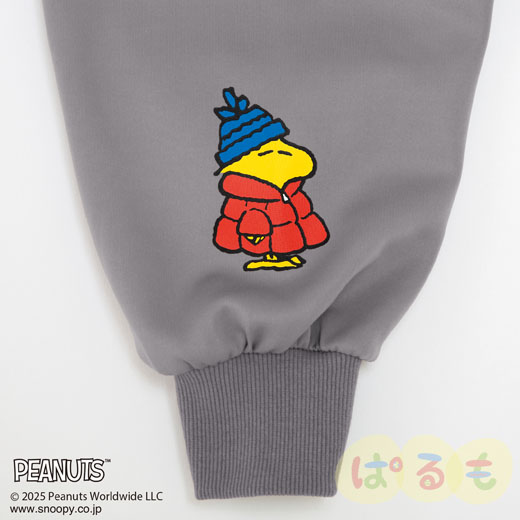 ニットとボアフリースのコンビ生地があったかいスヌーピーのスモックです。スヌーピーもウッドストックももこもこ冬仕様!